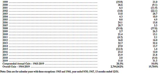 依照惯例,伯克希尔的业绩与美股风向标:标普500指数表现的对比,2019年伯克希尔每股市值的增幅是11.0%,而标普500指数的增幅高达31.5%,伯克希尔跑输了20.5个百分点。但长期来看,1965-2019年,伯克希尔每股市值的复合年增长率为20.3%,明显超过标普500指数的10.0%,而1964-2019年伯克希尔的市值增长率是令人吃惊的2744062%,也就是27440倍多,而标普500指数为19784%,即接近200倍。