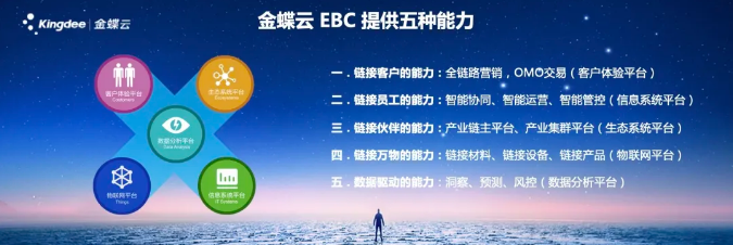 数据分析平台,由于有了数据分析平台可以帮助你更好地洞察、预测和进行风控。一个完整EBC系统要包含这5个部分。我们金蝶云提供了这种能力。