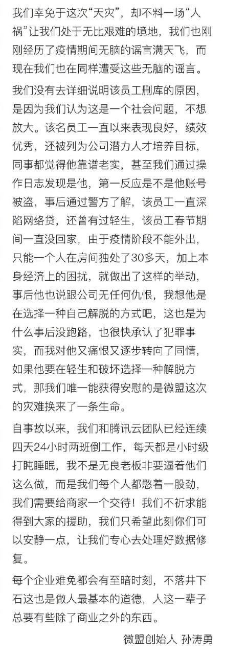 此前微盟创始人对“程序员删库”的回应