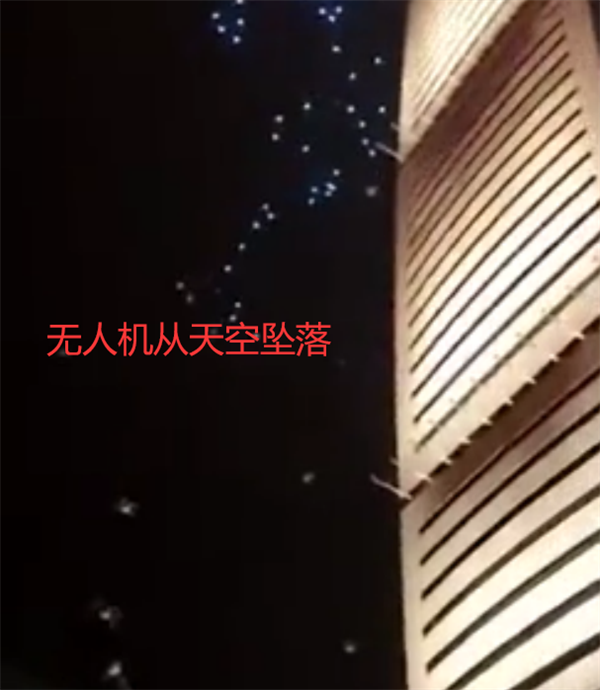 从现场视频和图片可以看到,一群带有蓝色灯光的无人机在飞行中出现异常,慢慢靠近旁边的一幢大楼,有的撞了上去,有的则直接从空中掉落。