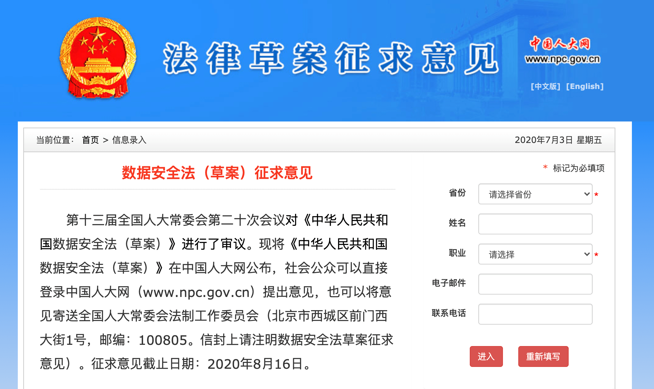 社会公众可以直接登录中国人大网提出意见,也可以将意见寄送全国人大常委会法制工作委员会(北京市西城区前门西大街1号,邮编:100805。信封上请注明数据安全法草案征求意见)。征求意见截止日期:2020年8月16日。