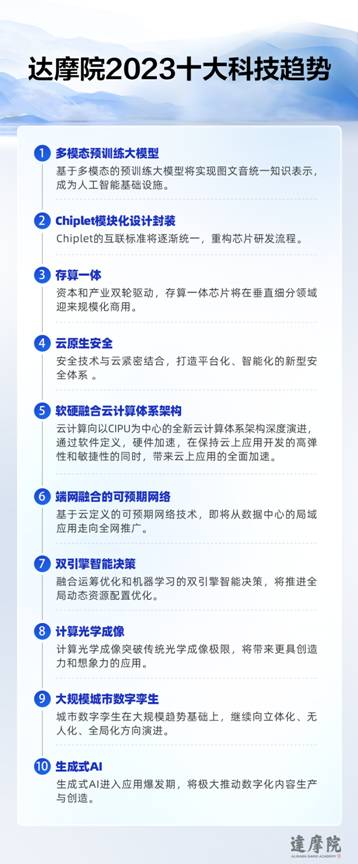 1月11日,达摩院2023十大科技趋势发布,生成式AI、Chiplet模块化设计封装、全新云计算体系架构等技术入选。达摩院认为,全球科技日趋显现出交叉融合发展的新态势,尤其在信息与通信技术(ICT)领域酝酿的新裂变,将为科技产业革新注入动力。