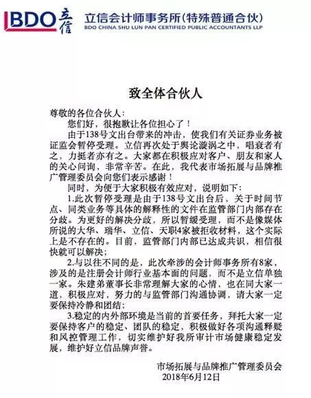 立信6月12日发布了致全体合伙人的告知信,信中明确提到“由于138号文出台带来的冲击,使立信有关证券业务被证监会暂停受理,立信再次处于舆论漩涡中,唱衰者有之,力挺者亦有之。”