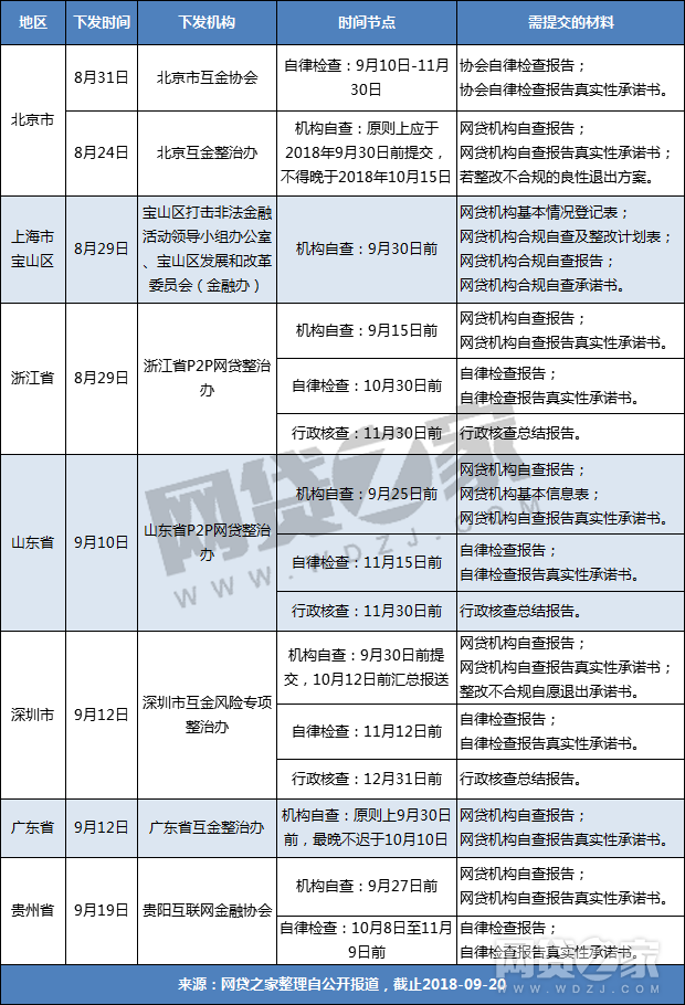 根据网贷之家统计,各地对平台自查截止的时间点不尽相同,多地规定原则上不晚于9月30日,但北京、深圳、广东均可宽限至10月中上旬左右,而浙江、山东和贵州则要求P2P平台在9月30日前完成自查。