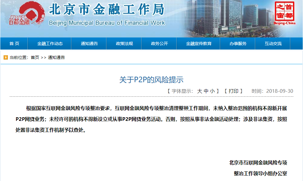 北京市金融工作局发布的通知显示,根据国家互联网金融风险专项整治要求,未纳入整治范围的P2P平台不得新开展P2P业务,未经许可的机构不得新设立或从事P2P网贷业务活动。否则,将被视为非法金融活动;涉及非法集资的,将按照非法集资予以查处。
