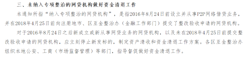 也明确表示,未纳入专项整治的网贷机构要做好资金清退工作,立刻停止新发标的,并制定资产清收和资金清退工作方案。