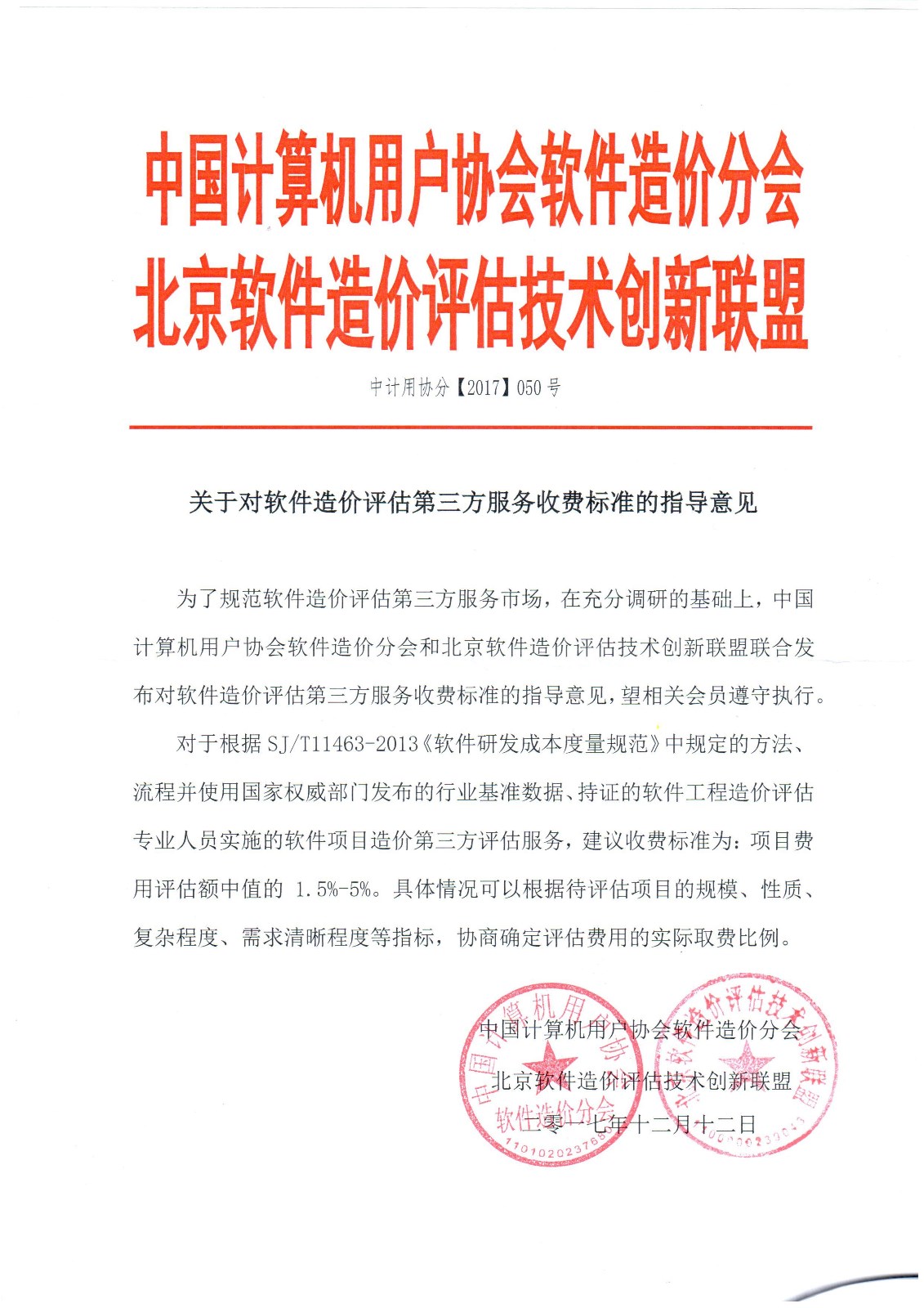 为了规范软件造价评估第三方服务市场,在充分调研的基础上,中国计算机用户协会软件造价分会和北京软件造价评估技术创新联盟联合发布对软件造价评估第三方服务收费标准的指导意见望相关会员遵守执行。
