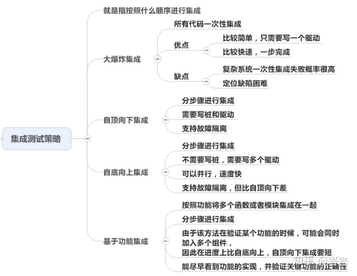 一、测试方法总结 二、单元测试 函数 函数就是一系列语句的集合,为了完成某个会重复使用的特定功能。 需要该功能的时候,直接调用该函数即可,不用每次都堆叠一大堆的代码。 驱动: 调用被测函数、将测试用例中测试数据传递给被测函数、将执行结果和测试用例中预期结果进行比较、输出测试执行结果 桩 用于替代被测函数所调用的其它函数,保证测试仅针对被测函数 在单元测试执行活动中需要完成驱动和桩的编写 单元测试:针对函数所开展的测试,检查函数代码实现是否,和LLD是否一致 单元测试从代码角度比系统测试测的更细,能测试很多系统测试所无法实现出来的情况,比如异常数据,从而能更好的保证代码的质量 三、集成测试 在单元测试的基础上,将所有函数按照概要设计要求组装成为子系统或系统所进行的测试,集成测试也叫组装测试、联合测试、子系统测试或部件测试 注意:集成测试和单元测试所关注的范围是不同的,因此,他们在发现问题的集合上包含有不相交的区域,不能使用集成测试来代替单元测试,反之也是一样 与概要设计的分层设计对应:模块内的集成(函数间集成),模块间集成,子系统间集成 集成测试的重点内容: 集成后的功能 功能之间可能会产生相互的影响 不同模块可能会同时访问光驱,产生冲突 ecshop注册功能,用户名与密码等函数单个没有问题,集成后,再使用,是否有影响 手机:通话、短信、闹钟、视频同时使用,有没有问题 内部的接口:函数间的相互调用、接口测试 集成测试策略: 集成测试的优点: 测试模块间的关联关系,可以使软件尽快稳定下来,可以尽早发现缺陷 向服务端发送一些前端不允许修改或添加的数据,查看服务端是否可以正常处理