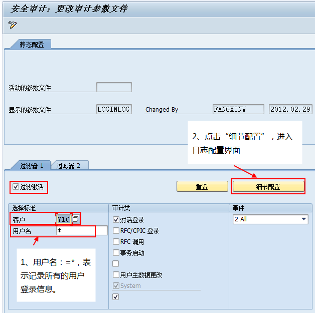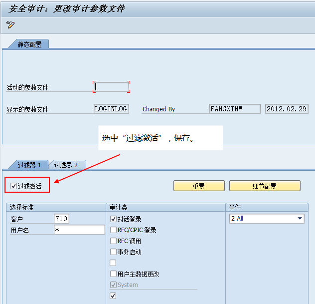 4) 激活审计参数文件:重新执行SM19,打开刚创建的参数文件:LoginLog