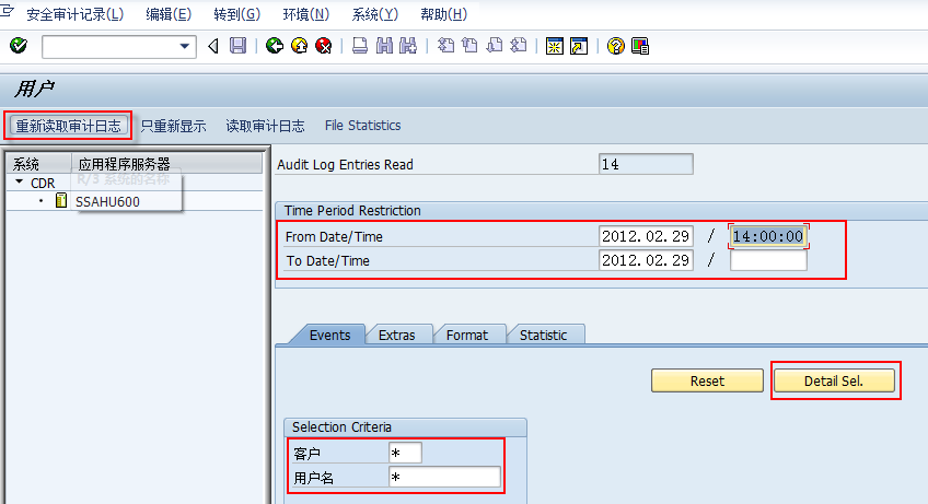 思路:在SM19中新建安全审计参数文件,然后在SM20中读取审计日志。