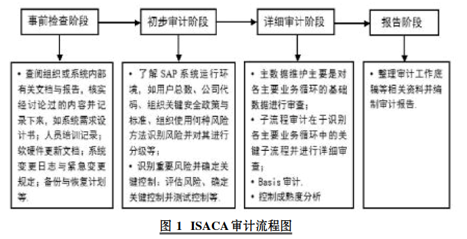 1. 审计流程。ISACA将审计流程分为事前检查阶段、初步审计阶段、详细审计阶段与报告阶段。事前检查阶段审计人员通过查阅系统开发与设计阶段的重要文档、观察数据库与应用程序服务器运行环境、评价备份与恢复计划有效性等措施了解企业。在初步审计阶段识别SAP系统的运行环境与关键控制。整个审计流程中最重要的阶段为详细审计阶段,根据组织的关键业务流程对具体系统应用控制进行实质性测试以判断相关业务的处理逻辑是否正确。在进行具体业务循环审查后通过分析控制成熟度,使利益相关者认识到组织现有控制水平与最佳实践的差别,体现内部控制的建立与优化。