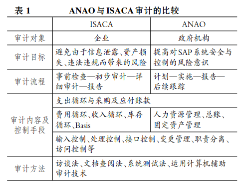 由于组织类型、规模、功能的差异,SAP系统的应用要求也有所不同。比如在审计内容上,因澳大利亚政府收入来源主要为国家拨款与项目基金,几乎不存在与销售货品相关的业务,据此ANAO弱化了与销售收入相关的审计活动,而ISACA将其视为关键环节。
