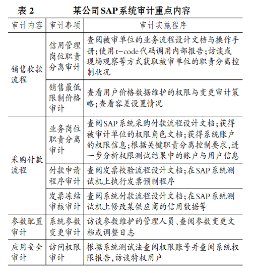 根据被审计单位风险环境与SAP系统审计框架的审计目标,审计人员重点关注了系统的可靠性与安全性,警惕系统缺陷与漏洞,督促企业加强对信息系统的经营管理并提高系统运行的效率。对部分重点审计内容和具体过程描述如表2所示。