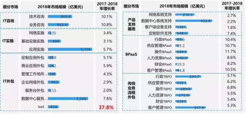 在IT服务细分市场中,IT外包服务中的IaaS年增长率最高,达37.8%;数据中心外包服务则最低,为-0.5%。