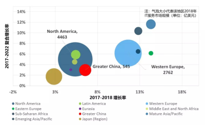 图3:2018年全球各地区IT服务市场规模及增长情况气泡图
