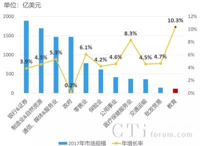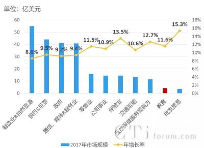 4、2017年全球教育行业IT服务市场规模排名末尾,但增长率居首位