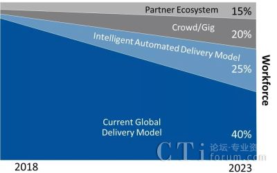 随着技术套利的出现,劳动力套利被快速取代,IT服务提供商将需要彻底改革其服务交付模式,以便通过智能自动化实现服务交付与全球交付、合作伙伴交付的均衡。