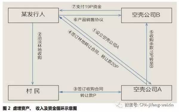 如图2所示,发行人第一步是先设立一家空壳公司A,专门用于与村民签订林地使用权转让合同;第二步是发行人与村民洽淡好林地使用权转让条件;第三步由空壳公司A与村民签订林权转让协议,并按约定支付村民转让款;第四步是空壳公司A与发行人签订林权转让协议,发行人按高价支付转让款;第五步是空壳公司A将剩余未使用完的林权转让款划转到空壳公司B;第六步是发行人与空壳公司B签订商品销售协议,空壳公司B将收到的林权转让款转回至发行人。经过上述过程后,除实际支付村民的林地转让款P外,其余资金19P从发行人以收购无形资产名义转出后,经空壳公司A、B,以销售回款的形式又转回发行人,实现了资金的循环,同时发行人账面虚增了19P的无形资产和19P的营业收入。