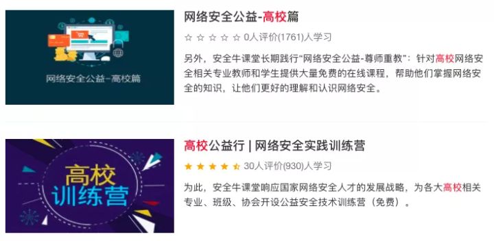 自2015年起,安全牛课堂为助力高校人才培养,为在校生提供学习平台,持续开展高校人才培养公益计划,免费为上千名高校生提供视频课程,涵盖Paython、Kali、CTF等视频内容,覆盖全国百余所高校。为高校生提升个人专业技能、提高知识水平、满足行业发展要求增砖加瓦。