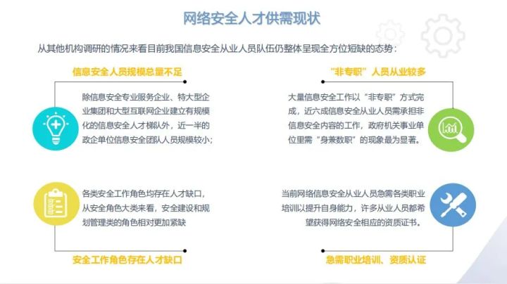 在此过程中,持续的网络安全组织建设、人才建设,是网络安全保障工作成功的关键。人才是网络安全组织建设中的核心驱动力,而人才的持续培养与评价直接影响着组织发展和持续运营。据统计,目前我国信息安全行业人才缺口超过140万,高端人才数量奇缺,但每年网络安全学历人才培养数量不足1.5万。