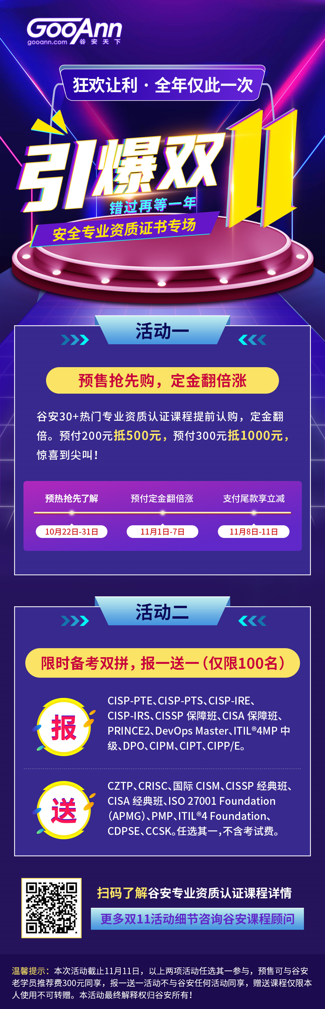 综上:今日份的证书汇总进行到这里,更深层次的了解可以直接咨询谷安课程顾问,谷姐后期还会再做分享,敬请关注! 微信扫码快速了解专业资质认证详情 温馨提示:11月11日23:59之前,谷安认证课程报一送一,预付定金200抵500、300抵1000,一年仅有一次,错过不再有!