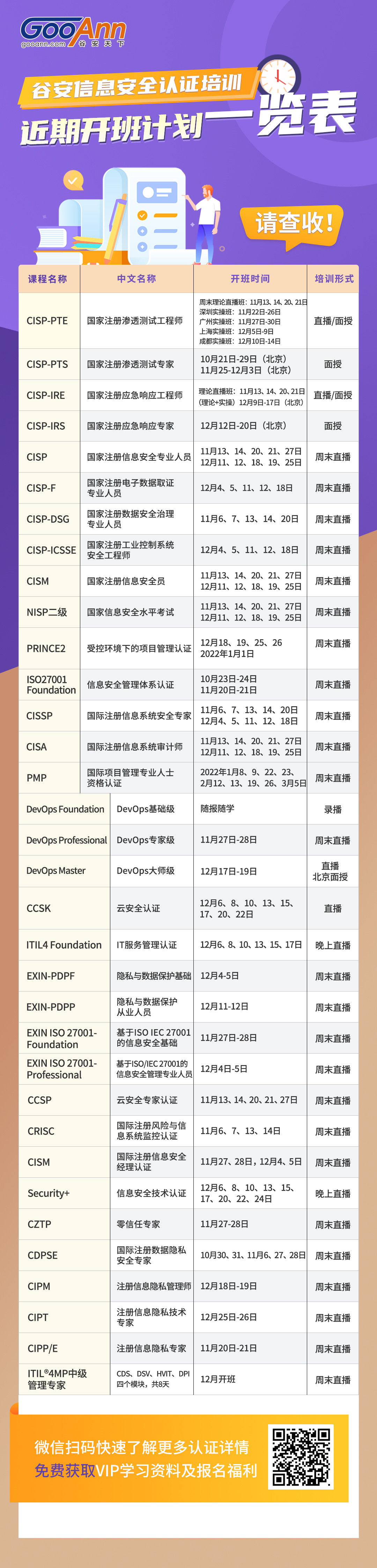1、DPO(数据保护官) DPO不是一门单独的考试而是一种集成认证,即(PDPF、PDPP、ISO/IEC 27001-F)三证合一,发证机构EXIN。报名无学历和工作经验硬性要求,证书无需维持终身有效,周末直播无需请假,线上培训随堂考试。DPO里的三门课程可以按需单考。适合所有GDPR中定义的需要了解数据保护和欧洲相关法律要求的组织成员/机构代表/企业员工。 DPO持证者充分了解欧盟GDPR法律法规条例,构建个人数据保护的知识体系和实施能力,梳理企业数据合规和安全需求,设定制度流程,进行数据安全体系建设。提升企业的数据安全和隐私保护能力,组织建设数据安全治理团队,规避企业违规成本。 2、ISO(信息安全官) ISO也是一种集成认证,同样发证机构是EXIN。与DPO不同的是,ISO是(PDPF+ISO/IEC 27001-F+ISO/IEC 27001-P)三证合一,少了个PDPP,多了个ISO/IEC 27001-P。报名无学历硬性要求,工作经验建议从事相关行业3-5年以上,证书无需维持终身有效,周末直播无需请假,线上培训随堂考试。 ISO/IEC 27001 Professional认证全称(EXIN Information Security Professional based on ISO/IEC 27001)基于ISO / IEC 27001的信息安全管理专业人员模块测试对信息安全的组织,物理和技术方面的理解。 3、CDSP(数据安全专家) CDSP数据安全专家认证,全称Certified Data Security Professional,云安全联盟大中华区颁发证书。是数据安全领域普遍认可的专业认证资质,以《数据安全法》和《个人信息保护法》为指导,针对云数据安全、ICT数据安全和新兴热点业务(如AI和 IoT等)的数据安全展开阐述,并结合各类新兴技术的不同场景,给出数据安全架构、安全设计、隐私保护的一般原则和业界最佳实践。 CDSP主要面向安全领域有相关经验的管理者和专业人士、相关研究人员,以及其它有志于从事数据安全领域咨询、管理和架构设计的人士。报名无学历和工作经验强制要求,线上考试,周末直播线上培训,无需请假。 4、CDPSE(数据隐私安全专家) CDPSE国际注册数据隐私安全专家认证,全称Certified Data Privacy Solutions Engineer,发证机构ISACA,目前已有20000人获得该证书。CDPSE认证帮助企业中的技术、安全、法律及合规人员更好地掌握数据隐私保护所涉及的相关管理和技术能力,助力企业更好落地隐私保护管理措施和技术方案,从而构建并提升更全面的数据隐私保护体系以应对不断变化的外部监管环境。 报考CDPSE需要在相关领域(隐私治理、隐私架构、数据生命周期)拥有至少3年经验的IT专业人员,不能替代和免除工作经验。直播培训无需请假,CDPSE认证被迅速接受,可以很好的帮助安全、隐私、审计、治理和风险管理专业人员,应对安全和数据隐私领域的新挑战。 5、CISP-DSG(注册数据安全治理专业人员) CISP-DSG是国内首个针对数据安全治理方向的国家级认证培训,证书持有人员主要从事数据安全治理相关工作, 具有数据安全治理过程管理、数据安全技术体系设计、数据安全管理体系设计的基本知识和能力。2021年9月1日《数据安全法》正式施行,数据治理专业人才将面临长期供不应求,提升数据安全保障能力,需要法规、人才、专业技术的强强结合。 CISP-DSG培训内容权威,实用性强,涵盖了近年来我国发布的数据安全、数据保护相关政策文件、标准规范,以及全球最新实践。报考条件:无学历和工作经验的强制要求,具备一定数据安全治理基础,或有意向从事数据安全治理的人员,通过中国信息安全测评中心组织的CISP-DSG考试即可获证。 6、IAPP三大认证(CIPM、CIPT、CIPP) IAPP协会针对隐私数据保护黄金标准提供三大证书认证,目前持证专家&行业领先技术人员在全球超过万人,针对所在企业需求进行隐私&数据保护、信息审核、信息安全、数据伦理、法律和数据风险管理。 CIPM (Certified Information Privacy Manager),信息隐私管理认证。对应领域:风险管理、隐私操作、审计、隐私分析、职责划分。 CIPT (Certified Information Privacy Technologist) 信息隐私技术认证。对应领域:信息技术(IT)、信息安全、软件工程、隐私设计。 CIPP (Certified Information Privacy Professional) 信息隐私专家认证。对应领域:法律法规、信息管理、数据管理、人力资源。 课程都是周末直播,不耽误工作无需请假,难易程度可以接受,通过率有保障。协助学员申请国内授权考点考位,备考和维持双重无忧,金牌讲师授课,精选题库,有备而战,精编模拟题,押题率较高,让学员备考做到游刃有余。 1、CISA(国际注册信息系统审计师) CISA作为信息系统管理与安全首选认证,一直名列“薪资最高证书之列”,是全球最受追捧证书之一,被誉为国内IT审计行业的“上岗证”,是IT审计师必备证书,也是会计及IT走向高薪的捷径。 中国获得CISA认证的审计师分布在银行、证券、政府、高端制造业、信息服务业、软件供应商、大型国有企业和上市公司等,越来越受到国内各大企事业单位认可。在国内,银监会要求各大商业银行必须拥有一定数量的CISA证书持有者,以便开展IT审计工作。 CISA认证适用度非常高,包括信息系统审计的从业人员, IT审计师、信息安全经理, IT风险管理、 以及财务、经营审计专业人员,企业信息系统管理人员、证券,金融,银行,审计局,审计公司,大型国企审计部门的专业人员。甚至很多的企业CISA证书都是必考的资质之一,否则在招标投标的过程中会受到很大的影响。CISA资格证书表明职业人作为合格信息系统审计、控制、鉴证和安全领域专