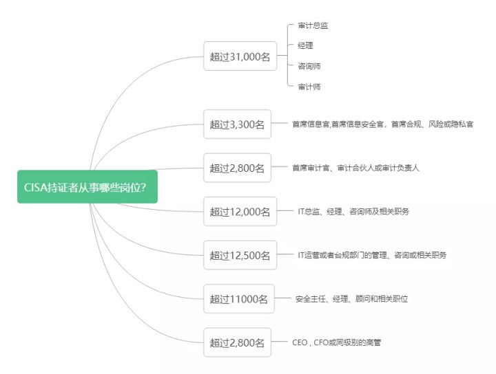 目前,CISA认证已经成为持证人在信息系统审计、控制与安全等专业领域中取得重要成就的象征。中国获得CISA认证的审计师分布在银行、证券、政府、高端制造业、信息服务业等高端行业内,越来越受到国内各大企事业单位认可。