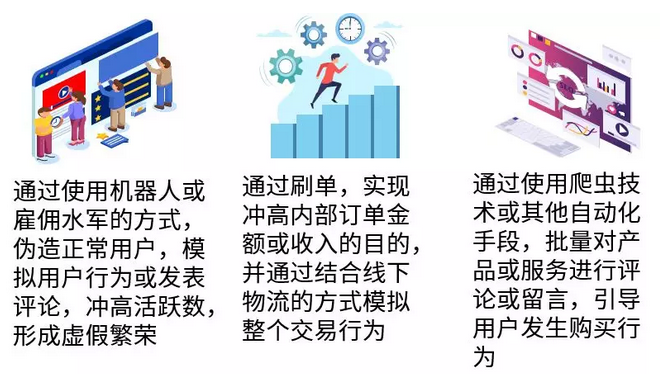 随着数据造假“产业链”的逐步成熟以及舞弊行为反排查手段的“日臻完善”,互联网企业逐步开始通过人工或机器模拟用户行为的方式在业务端进行业绩“注水”。也就是说,所有交易都是从前端发起,真实存在,但这些交易并非来自真正的客户。