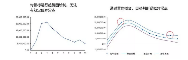 毕马威采用置信算法为趋势分析制定异常点“标尺”,在对指标数据进行曲线拟合的基础上,通过算法自动生成置信区间,对趋势中的异常变化自动预警,从而及时、有效地识别趋势中的异常波动,为投资人的分析与决策提供科学依据。