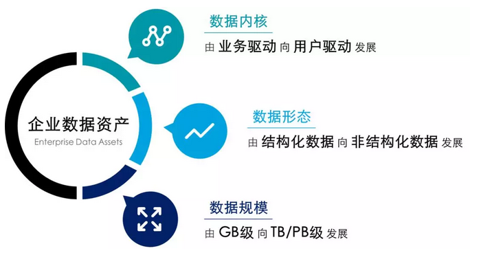 从互联网企业的数据资产发展来看,数据经历了驱动内核、形态和规模三个方面的变革。从数据内核来看,传统企业的数据产生方式往往是围绕业务环节的开展过程生成产品的生产、运输、销售等方面的数据;对互联网企业而言,数据往往来源于用户的各类使用行为,这就产生了浏览、点击、评论、图片上传等方面的数据。从数据形态来看,随着信息载体的多样化,诸如数字、文字这类结构化数据已不足以支撑多元信息的展示,图片、语音、视频等形式的非结构化数据变得更加常见。从数据规模来看,互联网企业的用户动辄上千万,数据量也从GB级向TB、甚至PB级别发展。