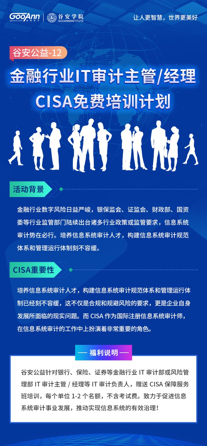 此次,谷安推出“谷安公益—12——金融行业IT审计主管/经理CISA免费培训计划”。致力于促进信息系统审计事业发展,推动实现信息系统的有效治理!欢迎更多金融行业IT审计相关负责人积极参与!