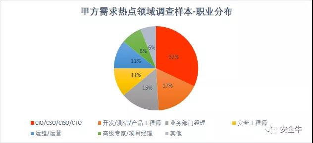 例如评价指标体系中“甲方需求热点领域”的评分基准,我们一对一调研了来自政府、金融、电信运营商、能源、互联网、制造业、医疗、教育等十多个行业多达105名央企及大中型企业的IT与安全技术决策者(CIO/CSO/CISO/CTO)。