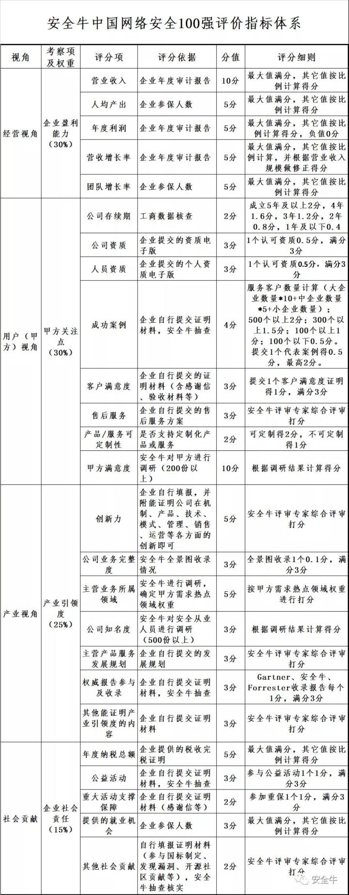 作为过去五年安全牛年度中国网络安全百强报告的第八版,本次报告首次进行评价指标体系重大调整,从经营、用户(甲方)、产业、社会贡献四大维度看安全,强调网络安全市场的生态与战略、技术创新与布局、客户价值与满意度的“三位一体”,并遵循三大新价值原则: