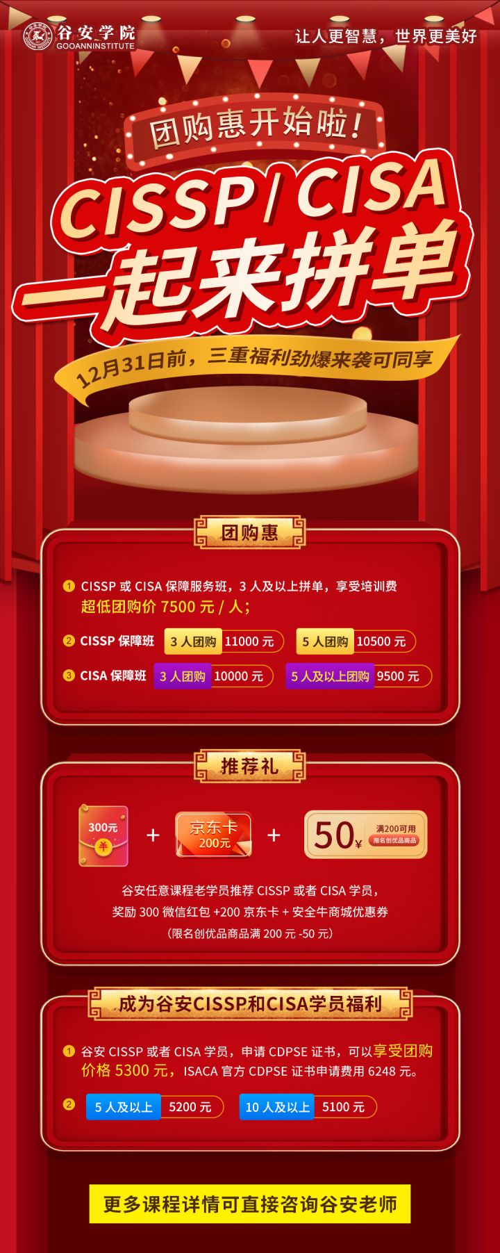 CISSP/CISA一起来拼单,福利送不停,谷安最后一次优惠政策!