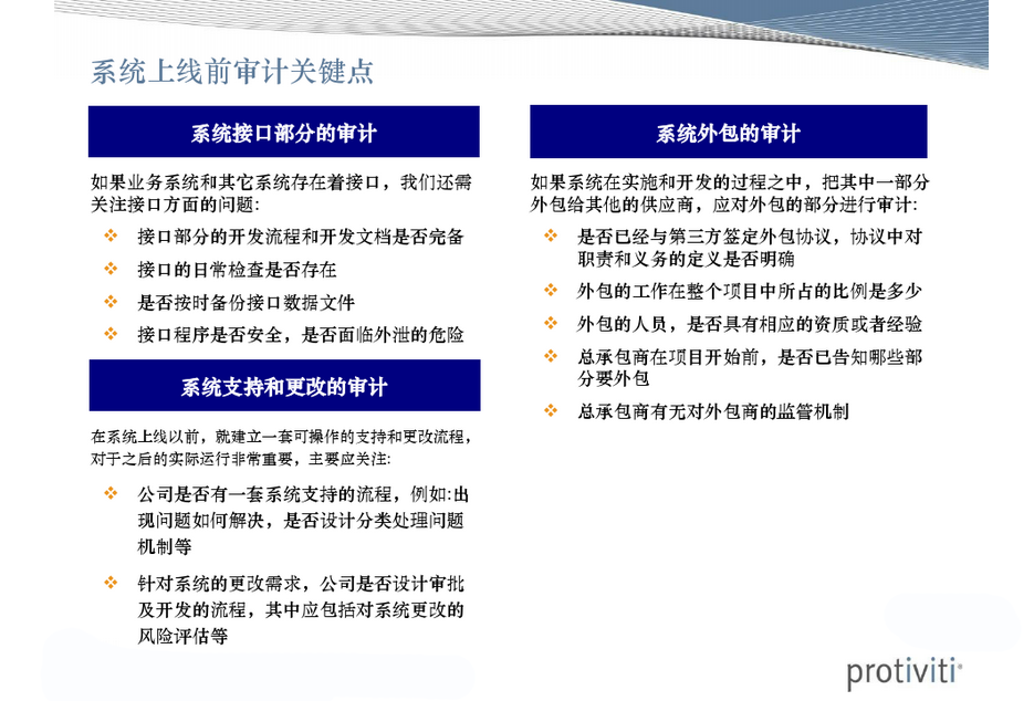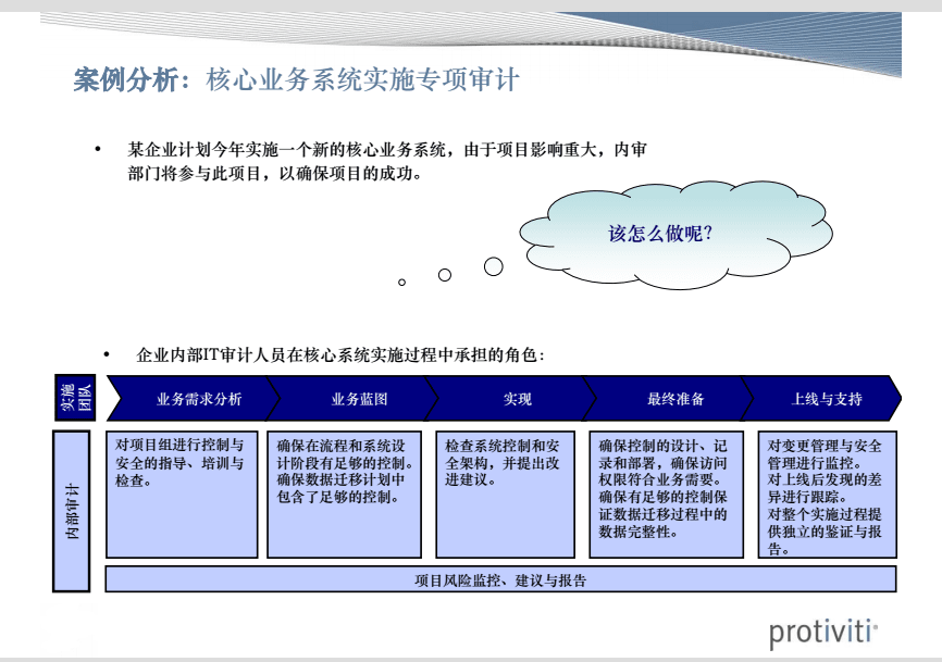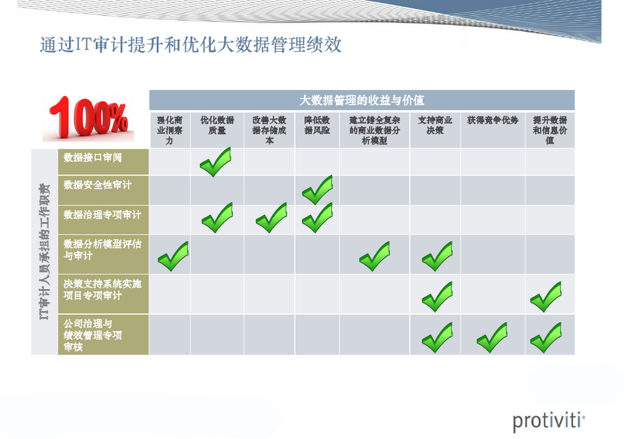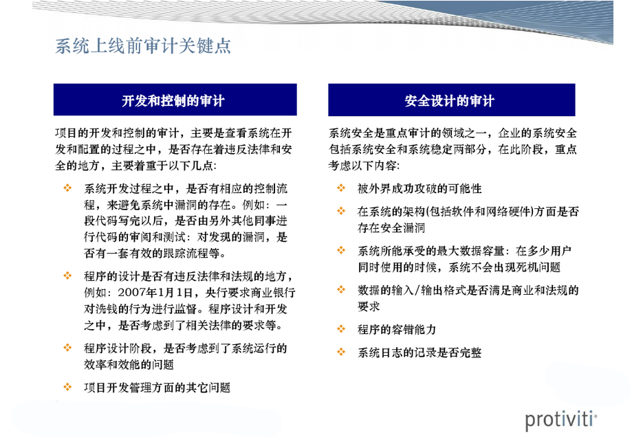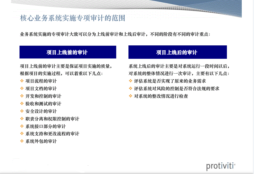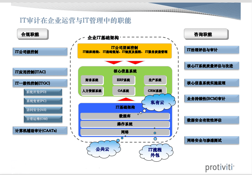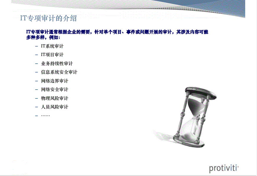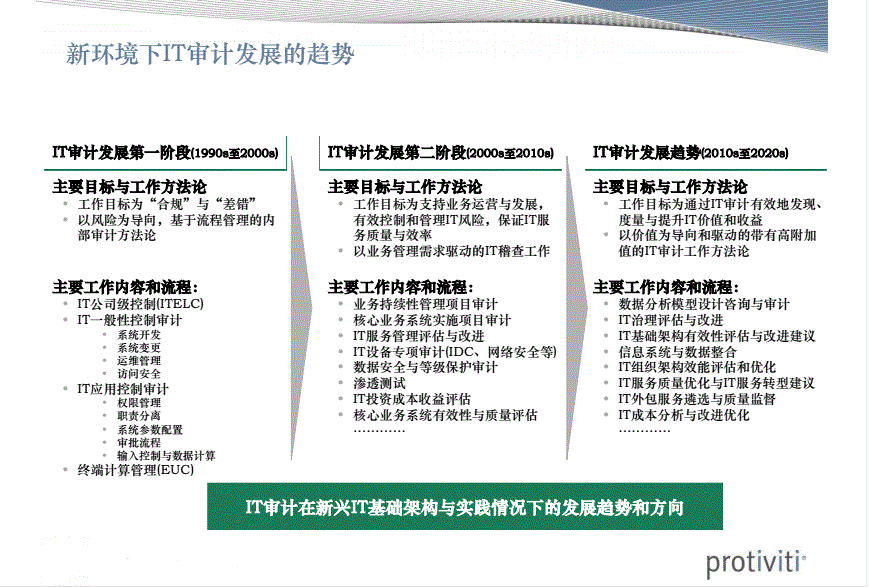 IT审计通过对企业的信息技术规划、管理、建设、运行、质量、安全等方面进行全方位的审计,充分识别与评估信息技术风险,提出完善措施建议,实现信息技术系统安全、稳定、合规、高效的运行,最终达到强化企业内部控制、有效控制信息技术风险、标准化和规范化信息技术服务管理、全面提高信息技术服务水平的目的。