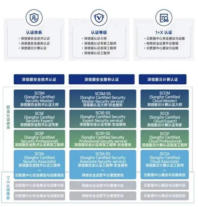 深信服致力于提供先进的人才培养理念及体系化的专业技术认证标准,培养全球领先的网络安全及云计算专业人才,技术认证体系不断升级,覆盖安全技术认证、安全服务认证和云计算认证三大认证体系,提供从工程师到大师的不同认证等级,满足各层次人才需求且符合各应用场景,全方位打造应用型专业人才,助力网络信息行业发展。