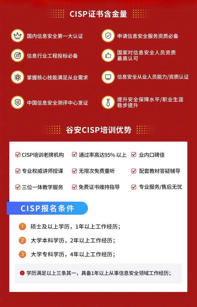 CISP作为国内第一大认证,是国内目前主流且被业内认可的专业信息安全技术与管理人员资质培训,不管是政府单位、金融、电力、交通能源、IT等相关行业均能得到高度认可,CISP的知识体系是国内从事信息安全工作专业人员能力考核、评估、认定的标准。