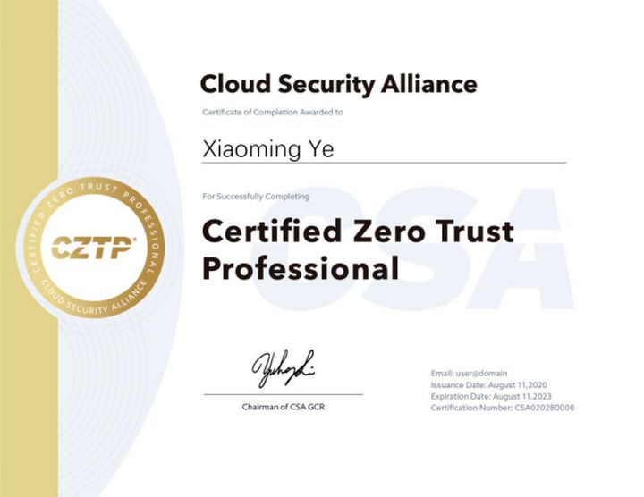 零信任CZTP(Certified Zero Trust Professional)零信任专家认证,是首个面向个人的零信任领域的安全认证,目的是通过对零信任架构、身份管理与访问控制、软件定义边界、微隔离等方面多维度进行系统性学习,结合场景、案例、规划与部署等角度,对零信任应用于实践等方面的学习,帮助网络信息安全从业人员掌握零信任知识,培养零信任安全思维,传播与践行零信任理念,助力新型网络安全人才培养。