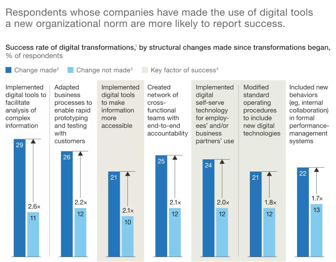 从上述表格来看,以过去的方式看待企业、组织的发展已经不占据优势,以未来的眼光看待组织变化与发展更贴合数字时代的发展。数字化转型已经极大改变了组织的运作方式。要想建立数字文化,做到真正的转型,只有通过改变领导团队和一线员工的思维方式和技能来实现。对于全公司而言,领导团队必须要提供一个清晰的发展愿景和策略,包括具体的目标,这样才能保证公司往正确的方向发展。对于一线员工而言,要帮助他们了解在转型中的角色,以及如何推动。当组织发展与数字转型战略保持一致,所有人感觉自己参与其中时,真正的变革就会发生。组织文化上的改变不可忽视。技术虽重要,但并不能代表数字化转型的一切。而组织文化一旦垮了,转型便会停滞不前。如何推动组织文化的变革,以实现数字化成功转型?我们总结了以下五个方法:数字化转型发生在公司的方方面面,尤其是人才队伍上。报告中,有70%的受访者表示企业高层团队在转型过程中发生了变化——最常见的情况是,熟悉新的数字技术的领导者加入了管理团队;不到1/3的受访者表示他们聘请了首席数字官(CDD)来支持公司转型。并且,调查结果表明,引入数字化高管的企业转型成功的几率是其他企业的1.6倍。注重培养普通员工的数字化能力更可能实现数字化转型。能力培养的几个关键点在于:首先重新定义个人的角色和职责,使其与企业转型的目标相一致,这也可以帮助阐释现在的企业所需要的员工能力。另外要发挥技术经理和数字业务管理者这两个新角色的作用,让他们弥补传统业务和数字业务之间的潜在差距。一般来说,技术经理需要拥有专业的技术能力,并领导公司的数字化创新工作;管理者需要将新的数字方法和流程,转换并整合到现有工作方式中,既需要有业务方面的经验,也需要了解新的数字技术。要发挥员工的价值,还要通过建立一定机制来调动他们的积极性。比如营造一个持续学习的、开放的工作环境,或者给予员工一定的权利,让其在数字化技术采用方面拥有发言权。当员工对数字化可能在哪些方面帮助企业有自己的想法时,企业数字化转型成功率更高。另外需要不断鼓励员工挑战旧的工作方式,并宽容失败。当高层领导和参与变革的领导都鼓励员工尝试新想法时,企业成功的可能性更大。最后还要确保部门、员工之间有交流协作。自转型以来,大部分企业做的7个结构变革,其中3个变革都涉及将数字工具作为新的组织规范的使用。充分利用数字化工具被设定为组织的新规范,更有助于转型成功。第一,采用数字工具,让企业信息变得更透明、更容易获得;除此之外,基于数据的决策的增加和交互式工具的使用也能帮助转型成功。正如我们在传统变革工作中所看到的那样,在数字化转型期间,清晰的沟通至关重要。更具体地说,成功的关键是传达变革故事,它可以帮助员工了解组织的发展方向,组织为何变化以及变化为何重要。在遵循这种做法的组织中,成功进行转型的可能性是三倍以上。第二个关键是高级领导者要培养紧迫感,以在其单位内进行变革,这是良好沟通的核心。其他结果表明,在沟通变革故事时,成功的组织倾向于传达比其他组织更丰富的故事。对成功影响最大的要素是组织关键绩效指标要有明确目标,以及清晰沟通转型的时间线。数字化转型和组织变革,两者是相辅相成的,在数字化转型过程中会涉及到组织变革,有效的组织变革能促进数字化转型的成果落地。在这个过程中有几点比较重要,需重点考虑:一是一把手工程,这个一把手是真正的一把手,如果没有领导的参与,组织变革很难推动;二是要重点考虑技术、流程和组织三者的融合;三是数字化转型是全面的,传统企业不能大刀阔斧地去做这个工作,一定是通过场景切入、以点带面,逐步带动全公司的数字化转型,有一个逐步的过程,切忌急于求成;四是伙伴的选择,大部分企业在数字化转型过程中完全依靠自己的力量,这是很难的。参考:《智能制造》麦肯锡报告:一般企业数字化转型失败率为80%